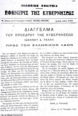 Η διορισμένη κυβέρνηση Ράλλη (η δοσίλογη) παραιτήθηκε στις 12 Οκτωβρίου 1944, η δε παραίτησή της δημοσιεύθηκε στο 242 ΦΕΚ με το Διάγγελμα του τότε «Προέδρου της Κυβερνήσεως Δ. Ράλλη προς τον Ελληνικόν Λαόν». Αυτό ήταν και το τελευταίο ΦΕΚ του έτους.