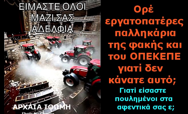 1 Είμαι κάθετα με το κλείσιμο των δρόμων από μια μερίδα καλοταϊσμένων λεγόμενων εργατοπατέρων, αφού η πλειοψηφία των αγροτών είναι μέσα στα χωράφια και παλεύει με την λάσπη τον πόνο και την δυστυχία/ΚΑΙ ΤΙΣ ΚΑΙΡΙΚΕΣ ΣΥΝΘΗΚΕΣ, άρα μιλάμε για δυο κατηγορίες αγροτών, αυτούς που είναι πάντα καπελωμένοι με την φτώχεια/ και αυτούς που κλέβουν τις επιδοτήσεις των δυστυχισμένων μικρών αγροτών, ας δούμε καλά το ΟΠΕΚΕΠΕ;;;;;
