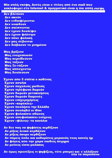 Λοιπόν τα έχω χαμένα όχι με τους 300 προδότες αλλά με την προδοτική συμπεριφορά του λαού κατά του εαυτού του! Πως να εξηγήσω όταν λένε μισές αλήθειες και μισά ψέματα, γνωρίζοντας ότι τελικά στο κεφάλι τους θα πέσει το κακό, τώρα ή αργότερα! Έψαξα σε όλο το διαδίκτυο να συναντήσω τον λαό τον ταλαιπωρημένο, τον αδικημένο, τον συκοφαντημένο, ελάχιστοι έως μηδαμινοί αυτοί που έχουν μεστό και υπεύθυνο λόγο και θέλουν να ξεφύγουν από την λάσπη και προδοσία των 300! Οι άλλοι σκυλοβρίζονται όταν έχουν την ίδια βρόμικη αντιμετώπιση από την κατοχική κυβέρνηση, τα ίδια προβλήματα, την ίδια δυστυχία! Και όμως βρίζονται χυδαία, πρόστυχα, συναγωνίζονται ποιος θα πει το μεγαλύτερο ψέμα, μη γνωρίζοντας ότι σήμερα εκεί που βρίσκετε η πατρίδα μας κάθε τους ψέμα και συκοφαντία είναι και μια μαχαιριά στους ίδιους και στην Ελλάδα! Πως μπορεί να το εξηγήσει αυτό που γίνετε τρεις μέρες πριν από τις εκλογές να κάνουν τα πάντα να επικρατήσουν οι εκτελεστές τους, οι βασανιστές τους, οι δολοφόνοι τους! Το ποιο τρελό είναι που έχουν γίνει όλοι ιδική στα εκλογικά και με ένα κομπιουτεράκι βγάζουν εκλογικά αποτελέσματα μυστικά και απόκρυφα! Και φυσικά απορρίπτουν ψήφο στο Ε.ΠΑ.Μ γιατί θα είναι άχρηστος ψήφος αφού δεν θα μπει στην βουλή, βγάλανε και τα αποτελέσματα, άρα σιγοντάρει την ΝΔ όποιος ψηφίσει Ε.ΠΑ.Μ! Ρε Πατριώτες θέλουμε αλλαγή και πολιτικής και πολιτικών ναι η όχι; Πως θα γίνει αυτό αν δεν το κάνουμε εμείς ο κυρίαρχος λαός; Θα έρθουν οι Ζουλού να ψηφίσουν για εμάς για να δούμε και μετά να διαλέξουμε; Τι τρελά πράγματα ακούγονται και γράφονται ανακατεμένα με κλάματα, οδυρμούς, κατάρες κοψοχέρηδες, αηδιασμένους, αλλά κριτές των πάντων!