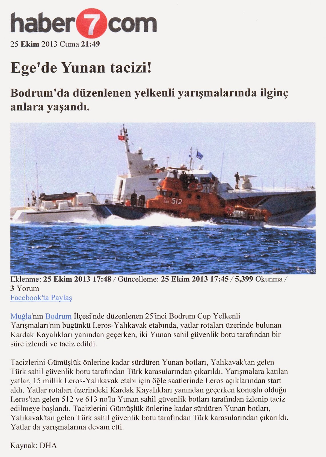 Όπως αναφέρει το τουρκικό πρακτορείο ειδήσεων η τουρκική ειδησεογραφική ιστοσελίδα, haber7com και το πρωτοσέλιδο της τουρκικής εφημερίδας Milliyet, (26/10), στις 25 Οκτωβρίου και κατά τις μεταμεσημβρινές ώρες σε νηοπομπή ιστιοφόρων θαλαμηγών στην γραμμή Muğla-Yalıkavak και ενώ οι θαλαμηγοί πλησίαζαν τις νησίδες των Ίμια, εμφανίστηκαν δυο πλοία της ελληνικής ακτοφυλακής τα οποία, σύμφωνα με τους Τούρκους, παραβίασαν τα τουρκικά χωρικά ύδατα. Μόλις αυτό έγινε αντιληπτό στον τουρκικό ναύσταθμο του Gümüşlük, σήμανε συναγερμός και στην περιοχή έσπευσαν πλοία της τουρκικής ακτοφυλακής με την εντολή να απομακρύνουν τα ελληνικά. Μάλιστα όπως υποστηρίζουν οι Τούρκοι, τα πλοία της ελληνικής ακτοφυλακής που είχαν υποτίθεται παραβιάσει τα τουρκικά χωρικά ύδατα, είχαν τα νούμερα 512 και 613. Τα τουρκικά πλοία πλησίασαν πολύ κοντά στα ελληνικά και ζήτησαν από τα ελληνικά να απομακρυνθούν από τα, σύμφωνα πάντα με τους Τούρκους, τουρκικά χωρικά ύδατα. Φυσικά τα ελληνικά πλοία αρνήθηκαν προφανώς γιατί η περιοχή δεν ανήκει στα τουρκικά χωρικά ύδατα. Ακλούθησαν επικίνδυνες μανούβρες και προς στιγμή απειλήθηκε σύγκρουση ενώ οι Τούρκοι από ότι φαίνεται ήταν έτοιμοι να χρησιμοποιήσουν τα όπλα τους κατά των πληρωμάτων των ελληνικών πλοίων. Σύμφωνα με τις πληροφορίες από τον τουρκικό ναύσταθμο του Gümüşlük, μετά από τις επικίνδυνες μανούβρες και ενώ το θερμότερο είχε ανεβεί επικίνδυνα, τελικά τα πλοία της ελληνικής ακτοφυλακής αποχώρησαν από την περιοχή. Μάλιστα οι Τούρκοι δημοσίευσαν και μια φωτογραφία που δείχνει την στιγμή που δυο πλοία έχουν πλησιάσει επικίνδυνα το ένα το άλλο στην περιοχή του επεισοδίου.