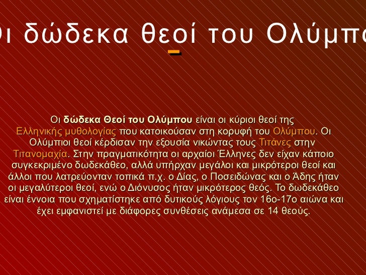 • 3. Οι δώδεκα Θεοί του Ολύμπου είναι οι κύριοι θεοί της Ελληνικής μυθολογίας που κατοικούσαν στη κορυφή του Ολύμπου . Οι Ολύμπιοι θεοί κέρδισαν την εξουσία νικώντας τους Τιτάνες στην Τιτανομαχία . Στην πραγματικότητα οι αρχαίοι Έλληνες δεν είχαν κάποιο συγκεκριμένο δωδεκάθεο, αλλά υπήρχαν μεγάλοι και μικρότεροι θεοί και άλλοι που λατρεύονταν τοπικά π.χ. ο Δίας, ο Ποσειδώνας και ο Άδης ήταν οι μεγαλύτεροι θεοί, ενώ ο Διόνυσος ήταν μικρότερος θεός. Το δωδεκάθεο είναι έννοια που σχηματίστηκε από δυτικούς λόγιους τον 16ο-17ο αιώνα και έχει εμφανιστεί με διάφορες συνθέσεις ανάμεσα σε 14 θεούς. Οι δώδεκα θεοί του Ολύμπου