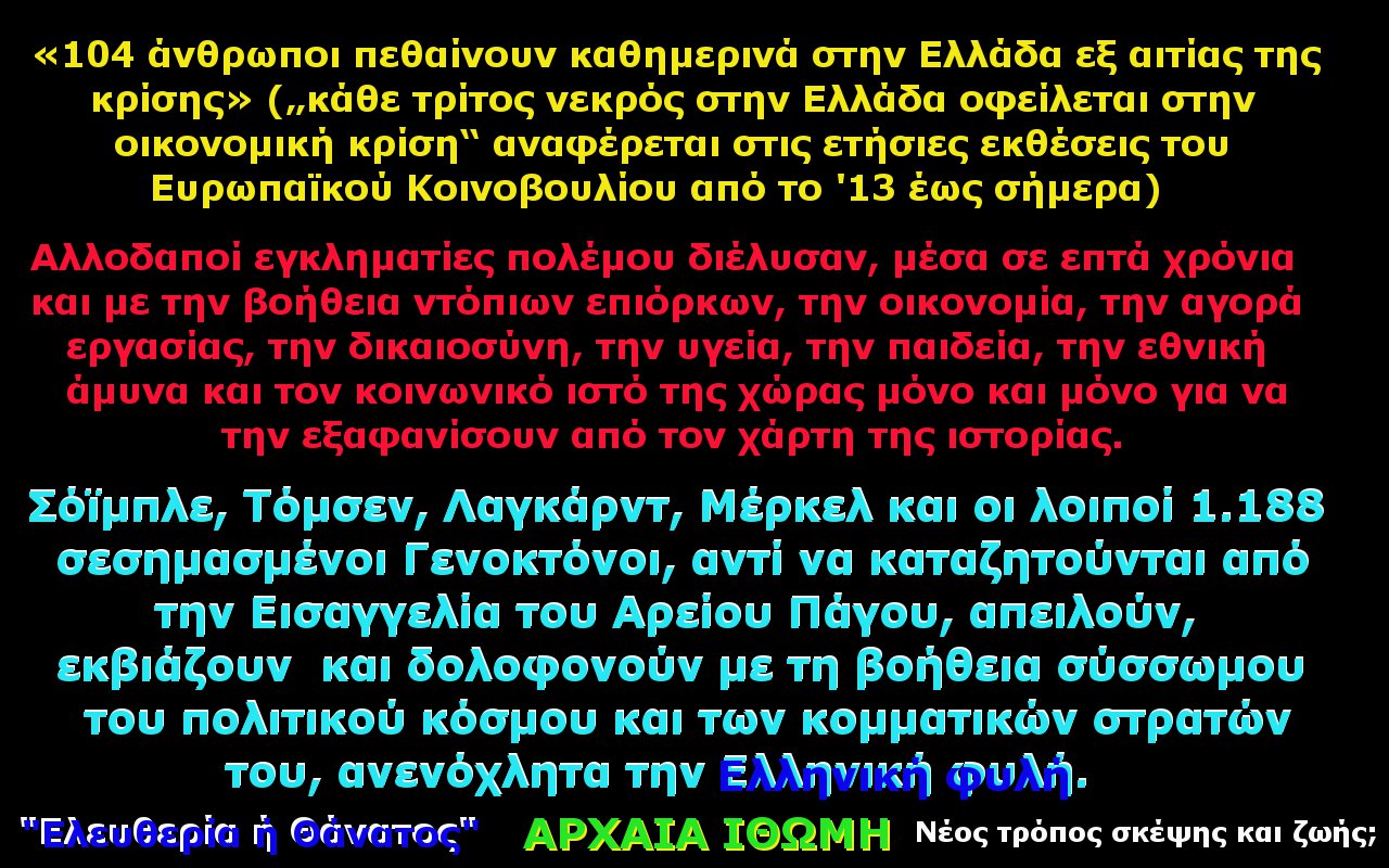 «104 άνθρωποι πεθαίνουν καθημερινά στην Ελλάδα εξ αιτίας της κρίσης» („κάθε τρίτος νεκρός στην Ελλάδα οφείλεται στην οικονομική κρίση“ αναφέρεται στις ετήσιες εκθέσεις του Ευρωπαϊκού Κοινοβουλίου από το ’13 έως σήμερα)