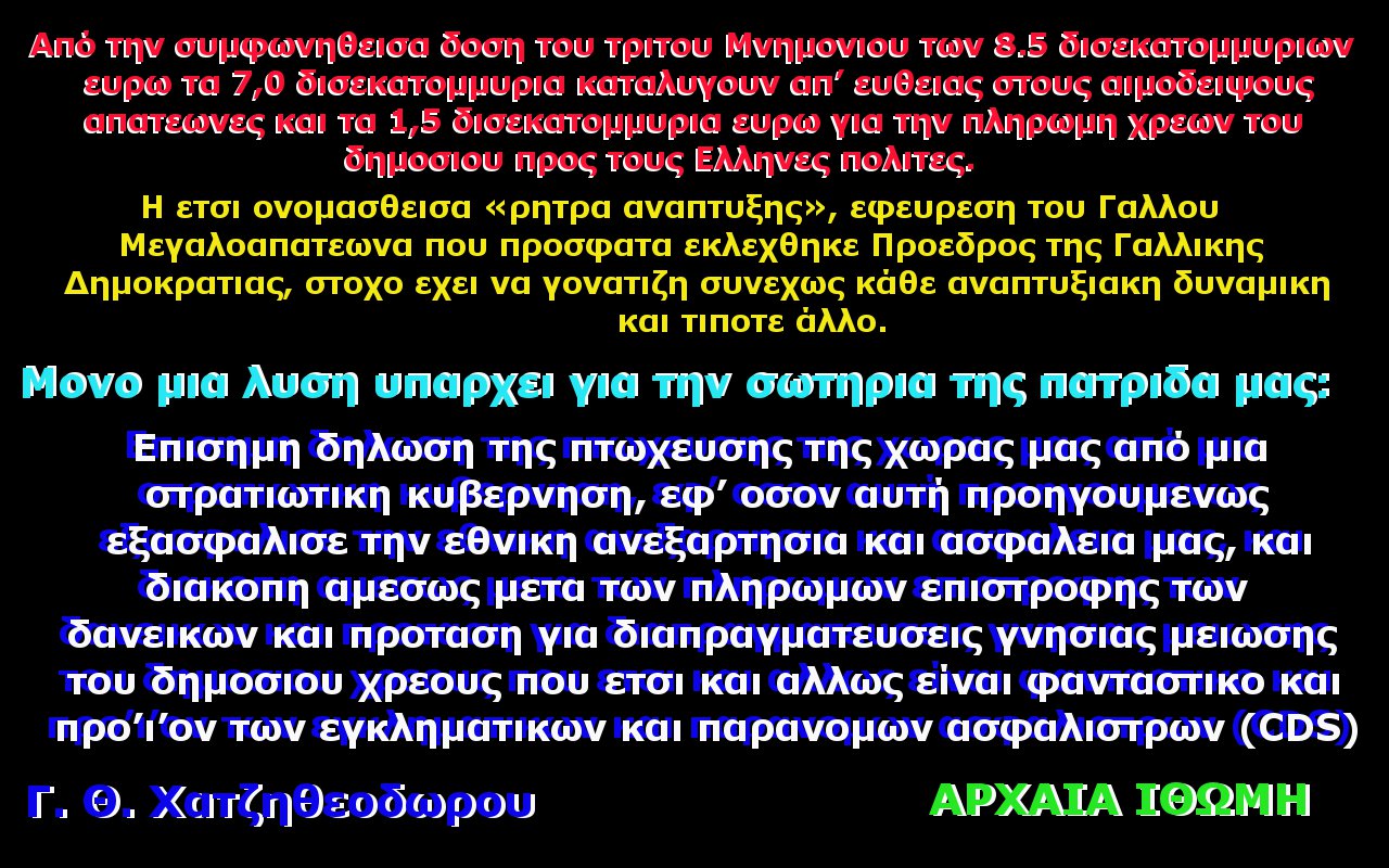 Δεν είναι μόνον η συστηματική καταστροφή της Ελληνικής βιομηχανίας , ο δραστικός περιορισμός της Αγροτικής παραγωγής (στο βαμβάκι και ελαιόλαδο) , η πλήρης εξάρθρωση της παρακτίου αλιείας , η επιβολή του οθνείου νομίσματος ,του ευρώ , και προσφάτως , η άνευ προηγουμένου εξάχνωσι του Ελληνικού Τραπεζικού συστήματος , όσον κυρίως ο δημογραφικός κατήφορος της χώρας και ο αποικισμός της από λαθρομετανάστες, που υπονομεύουν το μέλλον της χώρας”.