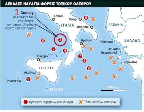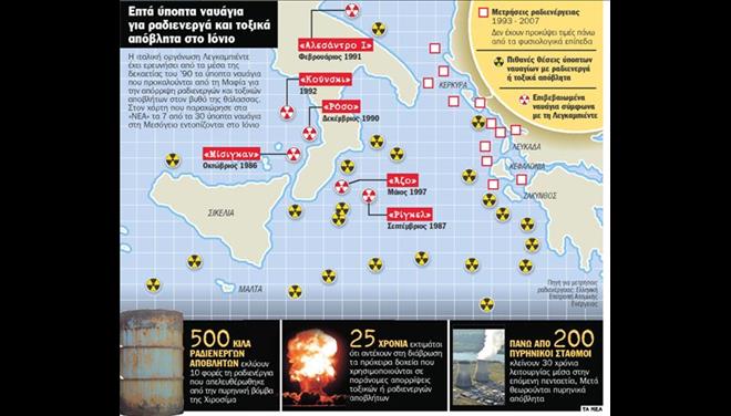 Ενενήντα εμπορικά πλοία-ραδιενεργές βόμβες βυθίστηκαν σκόπιμα στη Μεσόγειο Θάλασσα κατά την περίοδο 1985-1996, μετατρέποντας σχεδόν το σύνολο της θαλάσσιας περιοχής σε υγρό τάφο, με τις θανάσιμες συνέπειες (και για την Ελλάδα) που είναι δεδομένο πως υπάρχουν για την ανθρώπινη υγεία, αλλά και το οικοσύστημα, να παραμένουν ανυπολόγιστες!
