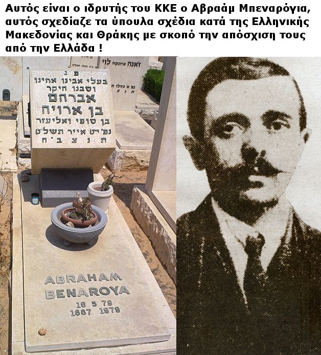 Ο κ. ΑΒΡΑΑΜ ΜΠΕΝΑΡΟΓΙΑ, πέθανε στο ΙΣΡΑΗΛ, ως γνήσιος Σιωνιστής και υπηρέτης ξένων συμφερόντων, ο συνιδρυτής δηλαδή του ΚΚΕ Ελλάδος, απεβίωσε και τάφικε με τη θέλησή του ΣΤΟ ΙΣΡΑΗΛ.