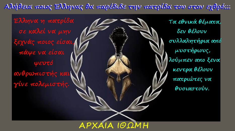 Η ΑΡΧΑΙΑ ΙΘΩΜΗ σεβόμενη τους αναγνώστες της, δηλώνει ότι αυτά που ανεβάζει τα δηπλοτσεκάρει για την γνησιότητά τους, όμως η τελική ευθύνη να διαπιστώσουν αν είναι αληθινά, μένει στους αναγνώστες και αυτό είναι μόνιμη παρότρυνση της ΑΡΧΑΙΑΣ ΙΘΩΜΗΣ.
