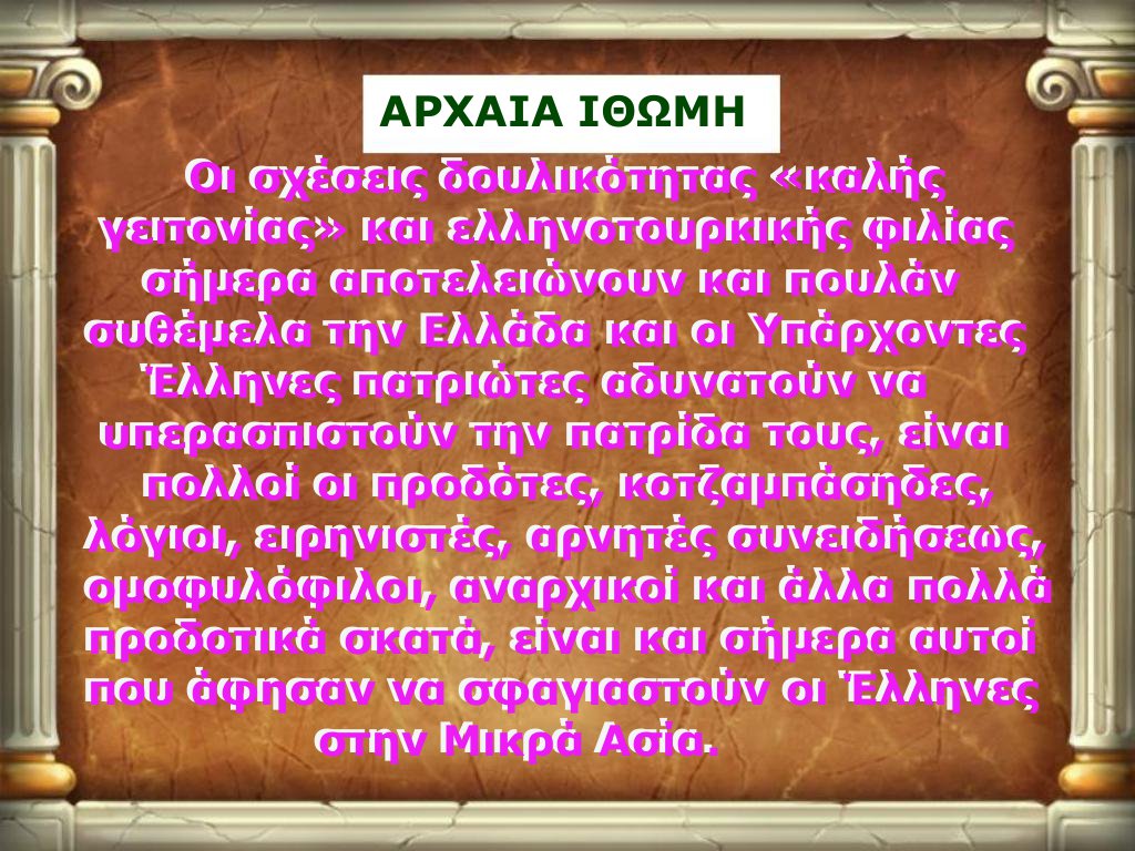 Η ΑΡΧΑΙΑ ΙΘΩΜΗ δεν είναι υπεύθυνος για τα σχόλια, τις απόψεις ή τις απόψεις των επισκεπτών του ιστότοπου και ότι ο ιστότοπος διατηρεί το δικαίωμα να αφαιρέσει προσβλητικά σχόλια ή εικόνες.