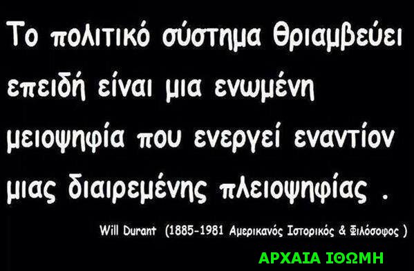 Αυτό που σημερα οι ελληνες πολιτες πρεπει να αντιληφθουν είναι, ότι για την τραγικη τους σημερινη κατασταση φταιει το ισχυων ακομη πολιτικο συστημα, το οποιο εχει κλεισει τον ιστορικο του κυκλο και θα πρεπει επιτελους να αντικατασταθει από ένα γνησιο ελλληνικο.