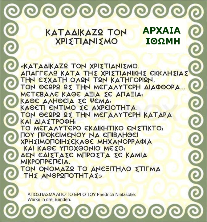 Εάν δεν «σκαψουν οι Ελληνες ενδον» δεν θα βρουν στα βαθη της σημερα εξαλλοτριωμενης ψυχης τους, την Αληθεια, την Ελευθερια, την Δικαιοσυνη, δηλαδη αυτές τις ελληνικες θεες, που γκρεμισαν από τα βαθρα τους οι βαρβαροι της Χριστιανοσυνης και τοποθετησαν στην θεση τους τα ειδωλα του δογματος, της εξουσιας και της δηθεν ισοτητας.