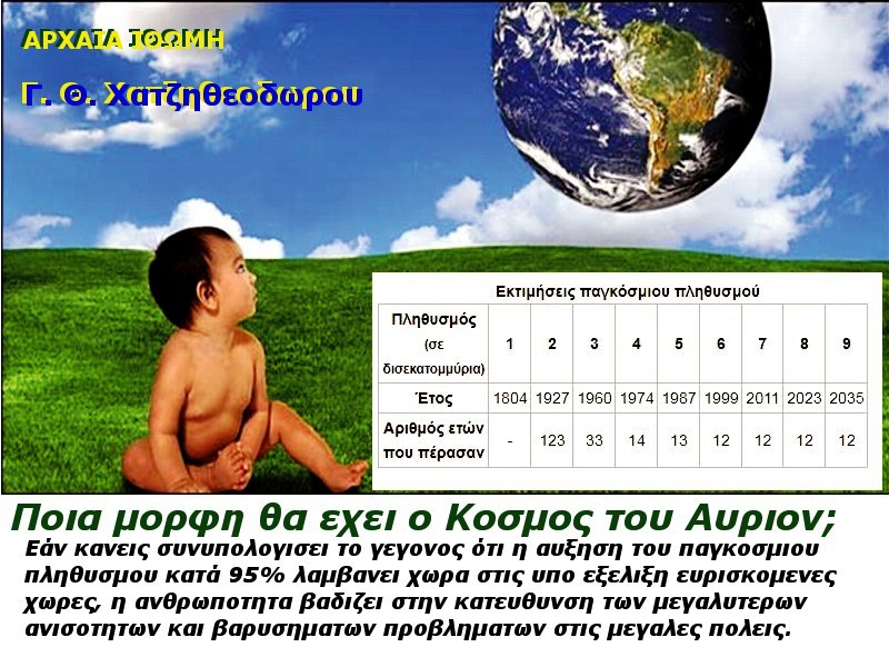 PD Dr.-Ing. Georg Chaziteodorou Bleibergweg 114 D-40885 Ratingen Tel.+Fax: 0049 2102 32513E-Mail: chaziteo@t-online.de02.09.2019Γ. Θ. ΧατζηθεοδωρουΠοια μορφη θα εχει ο Κοσμος του Αυριον;Εάν κανεις συνυπολογισει το γεγονος ότι η αυξηση του παγκοσμιου πληθυσμου κατά 95% λαμβανει χωρα στις υπο εξελιξη ευρισκομενες χωρες, η ανθρωποτητα βαδιζει στην κατευθυνση των μεγαλυτερων ανισοτητων και βαρυσηματων προβληματων στις μεγαλες πολεις.Στις βιομηχανικες χωρες αντιθετως λογω του γηρατος των πληθυσμων, η αθρωποτητα βαδιζει προς την κατυθυνση μειωσης του ενεργου πληθυσμου και οδηγει σε προβληματα της φροντιδας και των συνταξεων.Η ερωτιση ποσοι ανθρωποι μπορει να ζησουν στον πλανητη μας βρισκεται στο επικεντρο του γενικου ενδιαφεροντος και της Δημογραφιας.5 Σεπτεμβρίου, 2019, 6:25 μμ | ΚΑΤΗΓΟΡΙΑ: ΣΥΓΓΡΑΦΕΙΣ | Αφήστε ένα σχόλιο | |