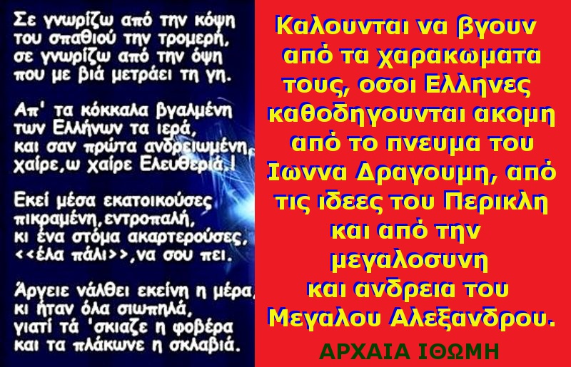 Γι’ αυτό καλουνται να βγουν από τα χαρακωματα τους, οσοι Ελληνες καθοδηγουνται ακομη από το πνευμα του Ιωννα Δραγουμη, από τις ιδεες του Περικλη και από την μεγαλοσυνη
