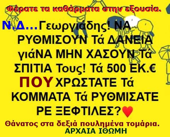 ΠΡΟΔΟΤΕΣ ο κάθε νοικοκύρης, είχε κάνει τα κουμάντα του βάση με αυτά που έπαιρνε, εσείς οι προδότες τους φεσώσατε με βρόμικα και ανύπαρκτα δάνεια και τώρα θέλετε να του πάρετε το σπίτι.
