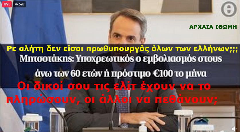 Αυτός ο αλήτης, ο προδότης από τα γεννοφάσκια του, μου έβαλε το μπιστόλι στον κρόταφο, στην κυριολεξία και μου είπε διάλεξε ρώσική ρουλέτα με το εμβολιο, η πρόστιμο, πόσο ποιο κάτω μπορούμε να πέσουμε σαν λαός;;; Αν δεν κάνω το εμβολιο θα πεθάνω από την πείνα, από το κρύο και τα φάρμακα, στην κυριολεξία, τι κοινωνία είναι αυτή που δέχεται ένα τετοιο τέρας στην ηγεσία του έθνους;;;;;;;;;;;;;;;;;; Να εκτελεί τους συμπατριώτες σου, τους θείους σου, τους γονείς σου, τους φίλους σου;;;;;;