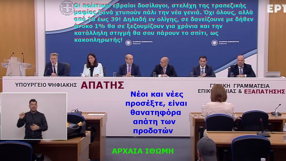 Η παγίδα των γενίτσαρων δουλικών της καταληφθείσας εξουσίας, με δήθεν δημοκρατικές διαδικασίες από ένα ξενόδουλο σύνταγμα, που και αυτό το ξενόδουλο σύνταγμα το παραβίασαν κατά κόρο, λοιπόν πήραν εντολές από το μαφιόζικο εβραϊκό τραπεζικό σύστημα FED ΔΝΤ Στουρνάρι να αποθηκεύσουν και την καινούργια γενιά, άλλωστε αυτό το δηλώνει η ανυποψίαστη δήθεν εξαγγελία, δικαίωμα στην απάτη και σε αυτούς που θέλουν να εξαπατήσουν έχουν μόνο από 18 έως 39;;;;;;;;;;;;;;;;;;;;