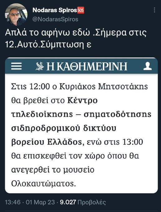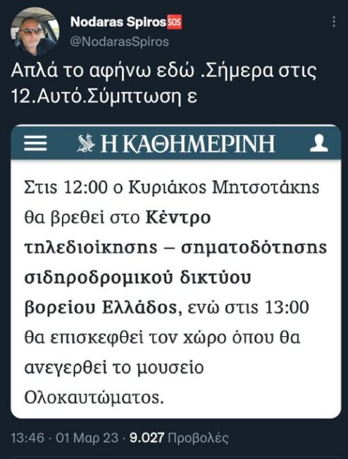 Θα ήταν κωμικό αν δεν ήταν τραγικό. Πρόκειται για αποκάλυψη του προέδρου του σωματείου μηχανοδηγών του ΟΣΕ, ο οποίος έκανε χθες -λίγες ώρες πριν το τραγικό συμβάν στα Τέμπη- ανάρτηση στον προσωπικό του λογαριασμό στο Facebook, στην οποία ανέφερε ότι ο πρωθυπουργός Κυριάκος Μητσοτάκης επρόκειτο να επισκεφθεί σήμερα το Κέντρο τηλεδιοίκησης – σηματοδότησης σιδηροδρομικού δικτύου βορείου Ελλάδος.