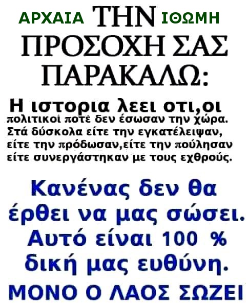 Προς ενημέρωση στους αναγνώστες. 4/8/2020Η ΑΡΧΑΙΑ ΙΘΩΜΗ δεν ανάγκασε ποτέ κανένα να κάνει κάτι με παραπλανητικές μεθόδους, αλλά ούτε με οποιοδήποτε τρόπο. Ο γράφων είμαι ένας ανήσυχος ερευνητής της αλήθειας. Και αυτό το κάνω με νόμιμο τρόπο. Τι σημαίνει αυτό; ότι έχω μαζέψει πληροφορίες επιστημονικές και τις παρουσιάζω, ή αυτούσιες, ή σε άρθρο μου που έχει σχέση με αυτές τις πληροφορίες! Ποτέ δεν θεώρησα τους αναγνώστες μου ηλίθιους ή βλάκες και ότι μπορώ να τους επιβάλω την γνώμη μου. Αυτοί που λένε ότι κάποια ιστολόγια παρασέρνουν τον κόσμο να μην πειθαρχεί… Για ποιο κόσμο εννοούν;;; Δηλαδή εκ προοιμίου θεωρούν τον κόσμο βλάκα, ηλίθιο και θέλουν να τον προστατέψουν;;; Ο νόμος αυτό το λέει για τους ανώριμους ανήλικους. Για τους ενήλικους λέει ότι είναι υπεύθυνοι για ότι πράττουν. Στον ανήλικο χρειάζεται ένας διπλωματούχος ιδικός για να τον δασκαλέψει, καθηγητής, δάσκαλος. Στους ενήλικες δεν υπάρχει περιορισμός. Ποιος λέει και ποιος ακούει, διότι ο καθένας ενήλικος είναι υπεύθυνος και προς τους άλλους και προς τον εαυτό του.