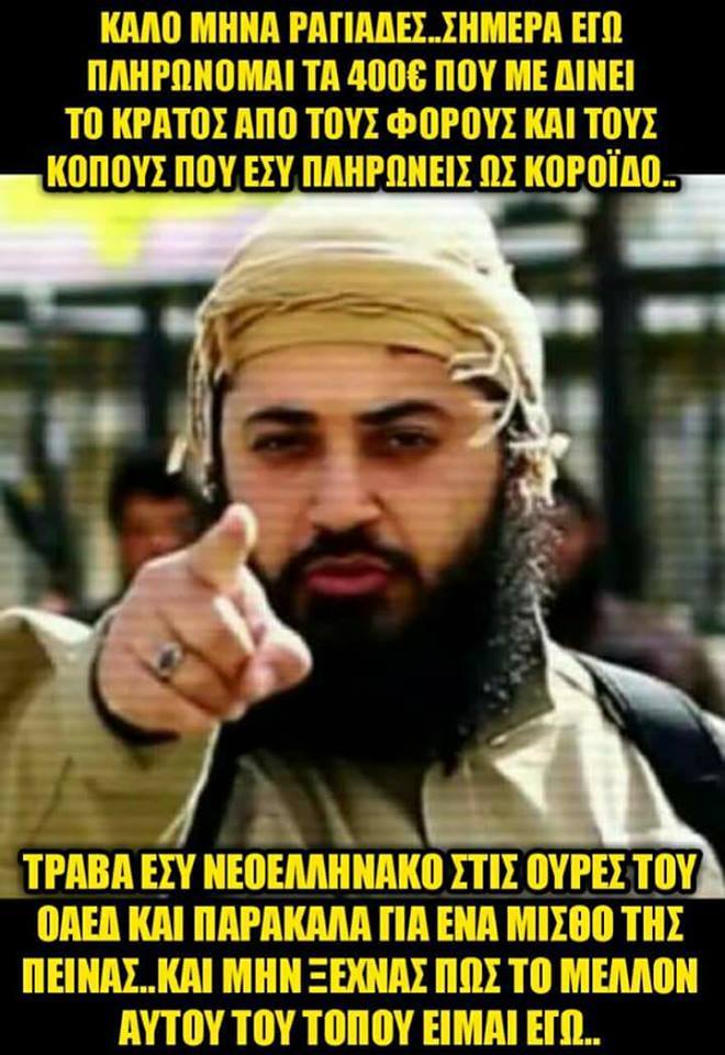 Αυτοί οο Έλληνες νέοι… Έχουν λόγους να πάνε στα χωράφια αντί με τους τίτλους σπουδών τους, να πάνε σε γραφεία ή και στο εξωτερικό.. αλλά με Βίζα και Διαβατήρια…. και μάλιστα εκεί που πάνε… δεν τους υποδέχονται ΜΚΟ να τους στηρίζουν ούτε τα Κράτη τους δίνουν τροφή με στέγη και περίθαλψη… παρόλο που πηγαίνουν ως μορφωμένοι να αποδώσουν άμεσα με επιστήμες κι όχι με τσάπα… ούτε να εγκληματίσουν ούτε να κραυγάζουν …Ζήτω ο Χριστός ο Μέγας…. ή να βιάζουν την κάθε γυναίκα ή και κοριτσάκι που βρουν ή να αποκέφαλίσουν όταν γουστάρουν !! Επομένως δεν είμαστε το ίδιο ρε μπουμπούνες !!