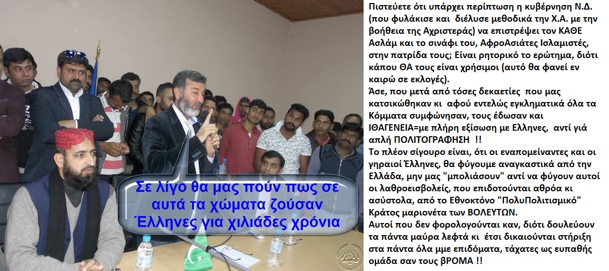 Πιστεύετε ότι υπάρχει περίπτωση η κυβέρνηση ΝΔ να επιστρέψει τον Ασλάμ και το σινάφι του στην πατρίδα τους; Ρητορικό το ερώτημα, διότι κάπου τους είναι χρήσιμοι (θα φανεί εν καιρώ). Άσε, που μετά από τόσα χρόνια που μας κατσικώθηκαν, μάλλον οι Έλληνες είναι που θα φύγουμε από Ελλάδα, παρά αυτοί….