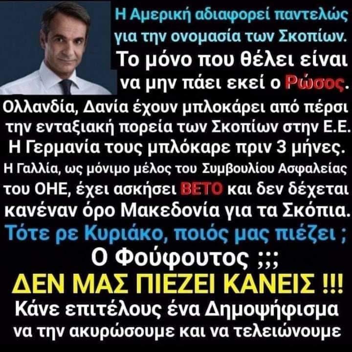Η «Συμφωνία τών Πρεσπών» δεν απετέλεσε «κεραυνό εν αιθρία» στην Ελλάδα. Τό σύνολο τών δημοσιογράφων (όλων τών συστημικών ΜΜΕ), τού πολιτικού προσωπικού (όλων τών κομμάτων) τής χώρας, αλλά και εκατοντάδες χιλιάδες Έλληνες πολίτες με «στοιχειώδη» μνήμη, εγνώριζαν εδώ και δέκα (10) χρόνια τούς τρείς (3) βασικούς άξονες τού Αμερικανο-Σκοπιανού Σχεδίου για τήν ονοματοδοσία αυτής τής νεοσύστατατης χώρας, ήτοι: (1) όνομα «Republic of Northern Macedonia» ή «Republic of North Macedonia», (2) γλώσσα «Macedonian language» και (3) εθνικότητα «Macedonian nationality».